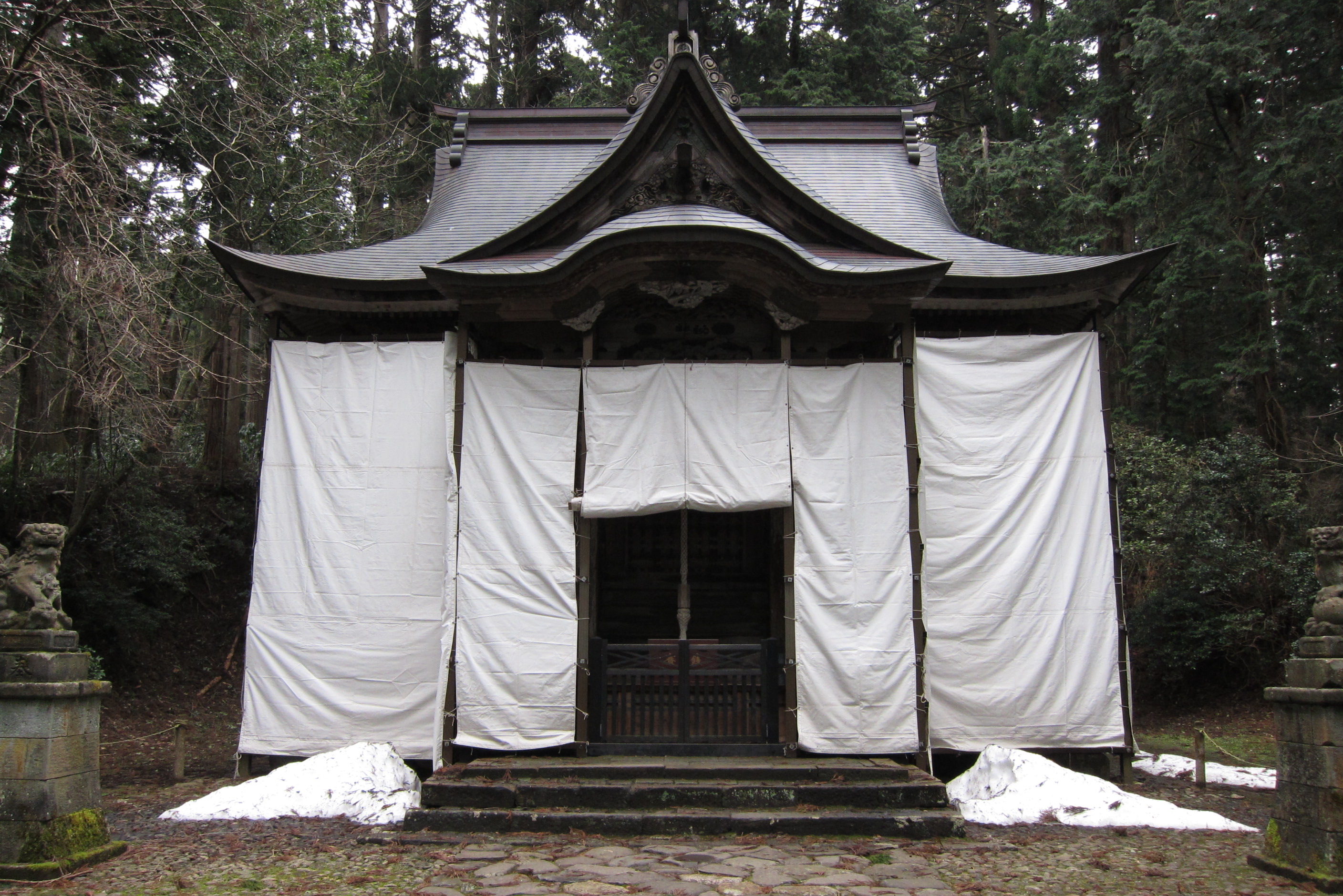 残念ながら垂れ幕で覆われていてあんまりよくわかりませんが、彫刻はすばらしいものであることがよくわかります。主祭神は伊奘冊尊とのことですが、これも後付けであり、実際はずっと白山権現を祀っていたわけです。