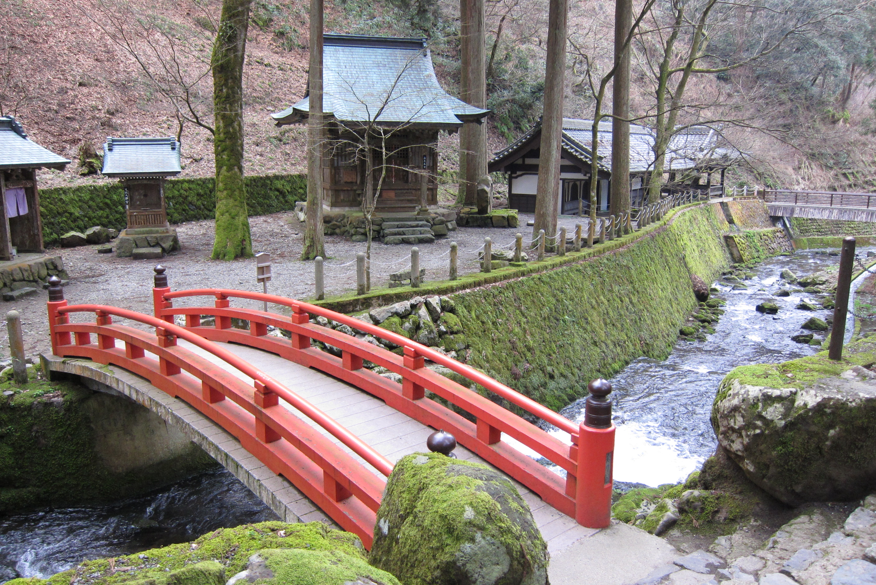 川を挟んで寺の向かい側にある鎮守社。左から地蔵堂、天照大神宮、金比羅堂です。画像外左側に稲荷堂もあります。手前の橋は偃月橋というらしいです。右奥は忘れました。。